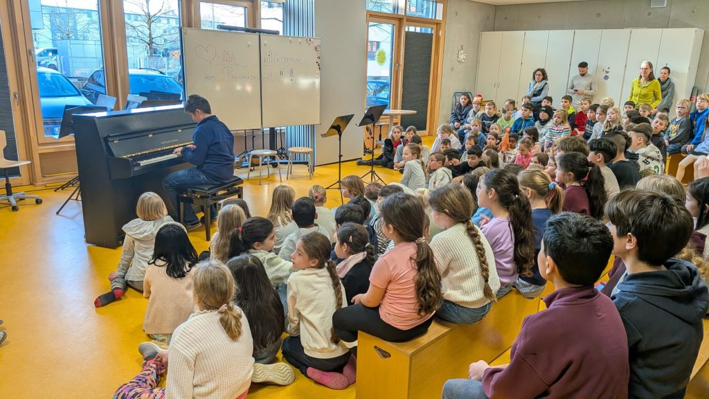 Vor Weihnachten gab es zwei Pausenkonzerte. Nach der Ankündigung im Schulfernsehen gab es rund 30 Kinder, die sich angemeldet haben, um in einer großen Pause im Musiksaal vor interessiertem Publikum ein Stück eigener Wahl auf einem Instrument vorzuspielen. Eingeladen ist jeweils die ganze Schulgemeinschaft (aber es kommen nicht alle – dazu wäre der Musiksaal auch…